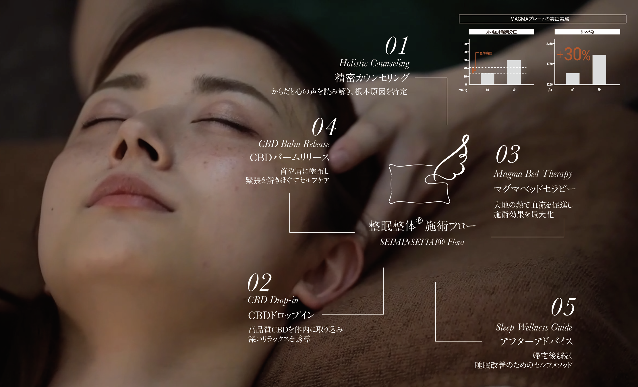 整眠整体®は、健康維持に不可欠な三要素「食」「運動」「睡眠」の中でも、特に「睡眠」にフォーカスした日本初の睡眠改善専門の整体サロンです。独自の寝起き無重力メソッド®は、眠りの質を根本から改善するための独自のアプローチを提供し、あなたのライフスタイルのパフォーマンスを最大化します。 「整体×整温×整活」の独自アプローチにより、一人ひとりに最適なスリープスタイルをご提案。深い眠りへと導くことで、美容効果やお仕事のパフォーマンス向上も期待できます。 寝起き無重力メソッド®の特長は、頭蓋骨矯正を通じて自律神経のバランスを整えることです。副交感神経を活性化させ、血流を穏やかにし、血圧を下げ、筋肉の緊張を緩和。これにより、寝付きが良くなり、眠りの質が向上します。また、骨格矯正、筋肉調整、腸調整にも副交感神経を活性化する効果があり、心身ともにリラックスした状態へと導きます。 施術前には、リラックスと回復をサポートするCBDティンクチャーとバームを使用して、体を内側から整えます。その後、富士山溶岩のMAGMAベッドで血流促進を図りながら、5つの手技でお客様一人ひとりに合わせた施術を行います。