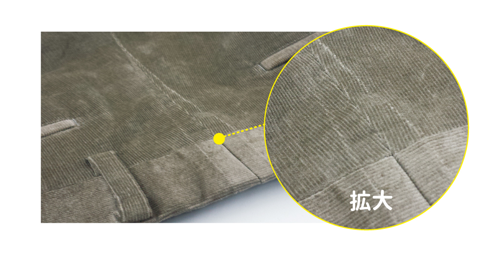 ※コーデュロイなど素材によっては、元の縫い目が薄く線のように残る場合があります。また、濃い色のパンツは縫い代側が日光や摩擦など外気に触れていないため、新品のように濃い色のまま残っている場合が多く色の差が出やすいので、ウエスト出しをされる際はご注意ください。