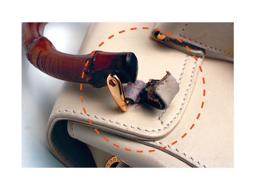 バッグの付け根は、一番負荷がかかって傷みやすい部分。ねじれたり、金具があたったり、劣化して革がちぎれたり(切れたり)…