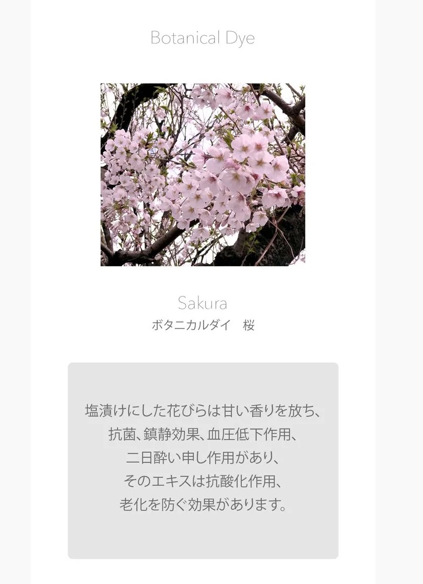 カラーは、ボタニカルダイで、「桜」で染めたピンク。塩漬けにした花びらは甘い香りを放ち、抗菌、鎮静効果があり、そのエキスは老化を防ぐ効果があると言われています。