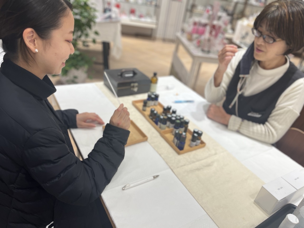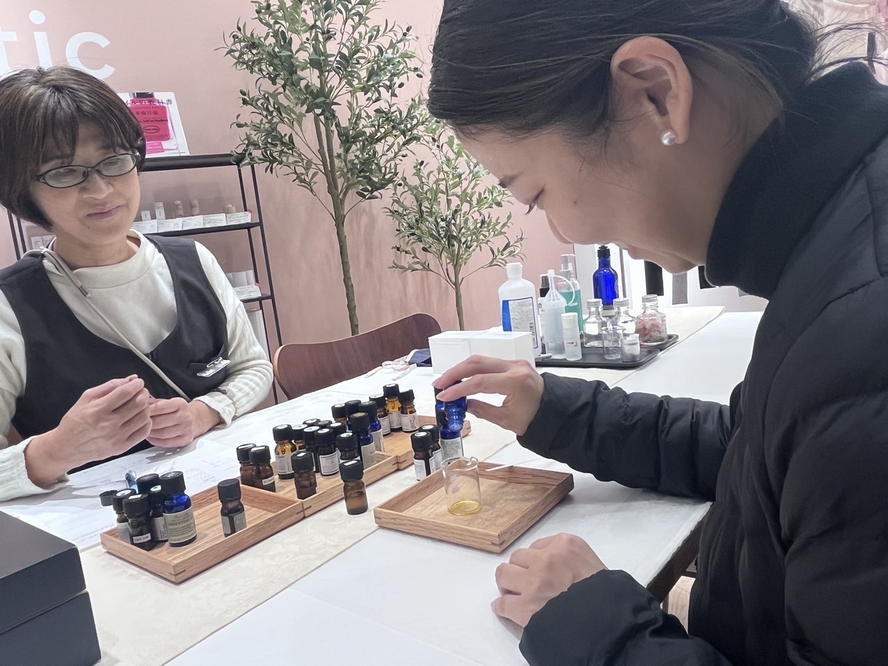 専門のセラピストと一緒に作っていきますので初めての方でも気軽に参加できます。重ねていく香りの変化をお楽しみください。