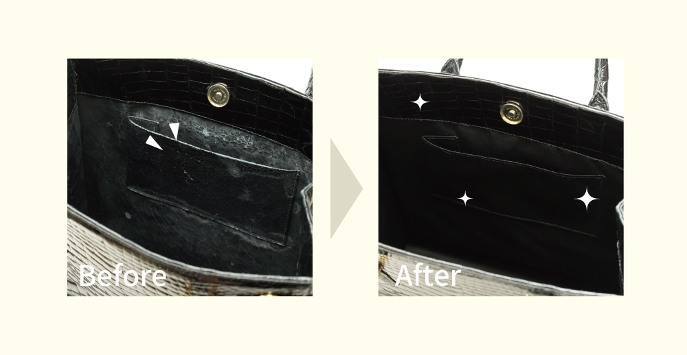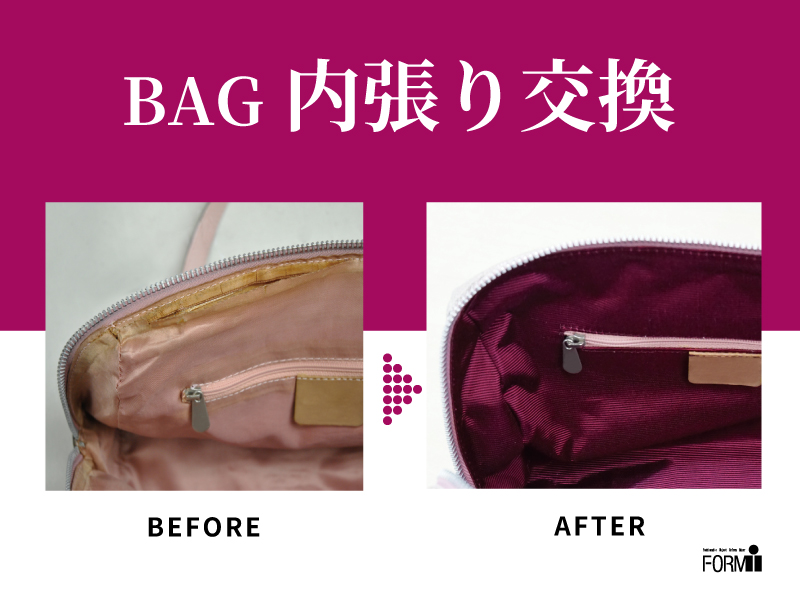 当店では、バッグ用の布地(シャンタン生地)を使用し、内側の袋の作り直しや貼り替えを行います。中にあるファスナーやポケット、ブランドタグなども元通り付け直しいたします。