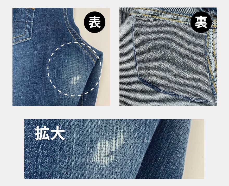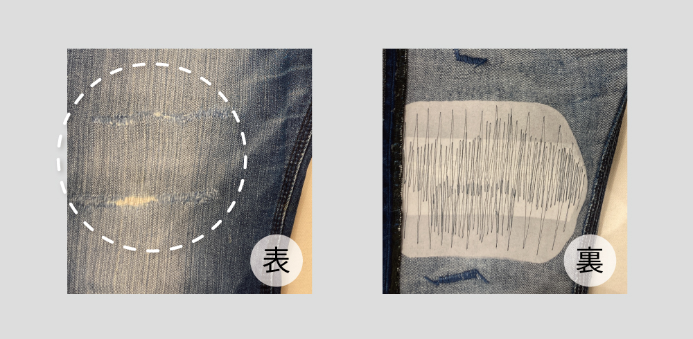 ↑↓ 当店では、裏に芯や生地を貼ってミシンで細かく縫って穴をふさぎます。ミシンで縫って補修するため、ミシン目が表から見えることをご了承ください。