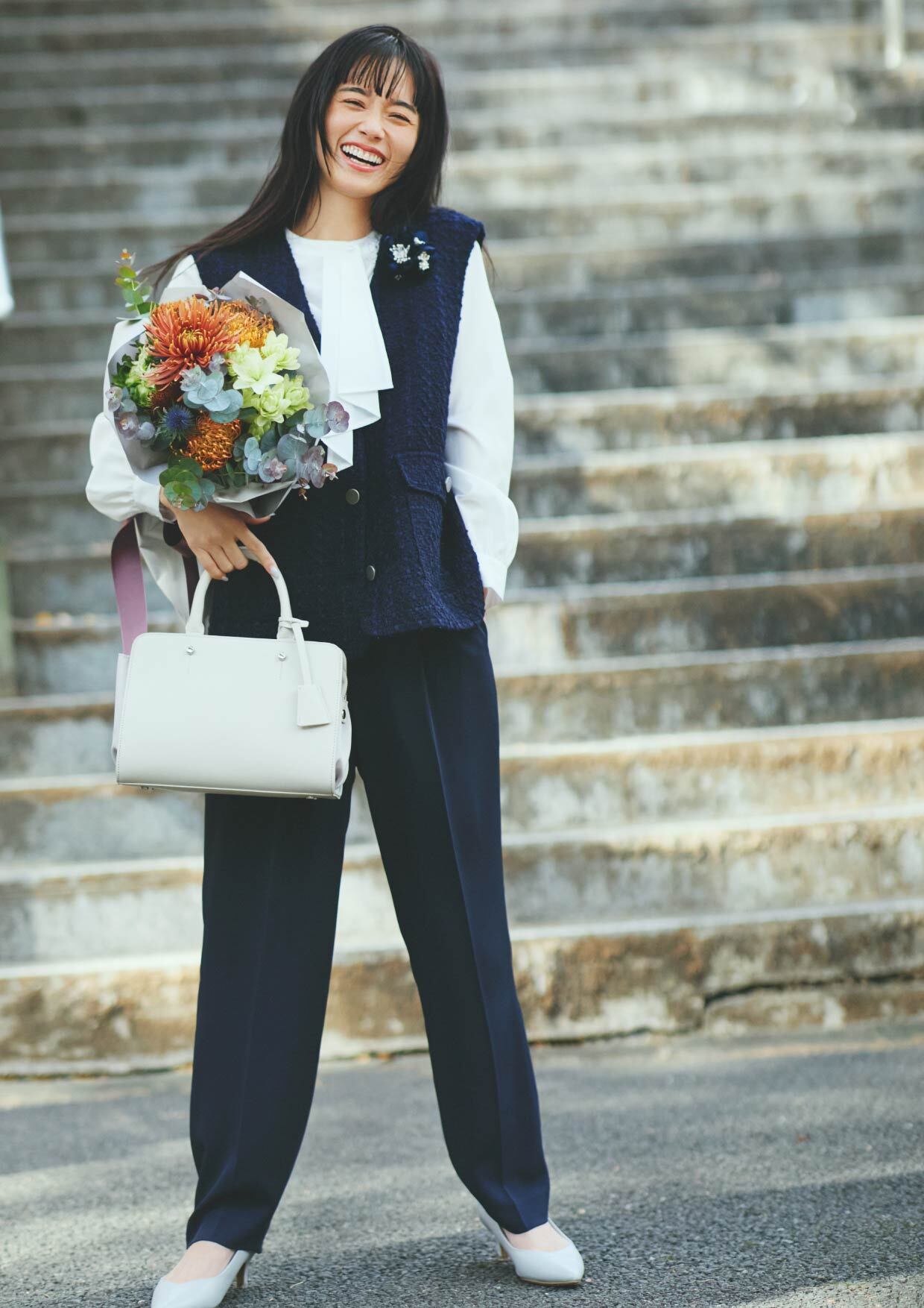 上品な印象のツイード素材を使った、ノーカラーのジレ。