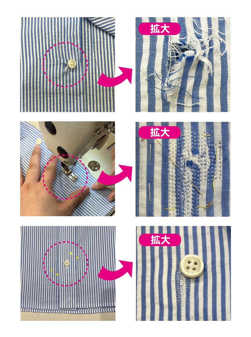 ↑画像のようにシャツのボタンが生地ごと破れて取れてしまっても、お直しができますので、諦めないでご相談ください。お直し方法などをご提案いたします。
