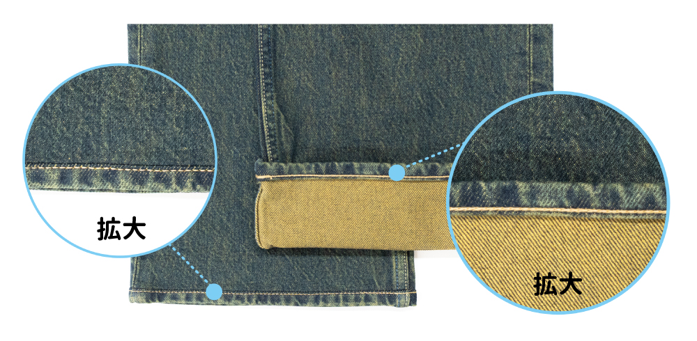 「裾残し加工」で裾上げをすれば、裾のすり切れた風合いを残して丈を短くすることができます♪(※元の裾を挟み込んで縫うため、少し厚みがでることをご了承ください)