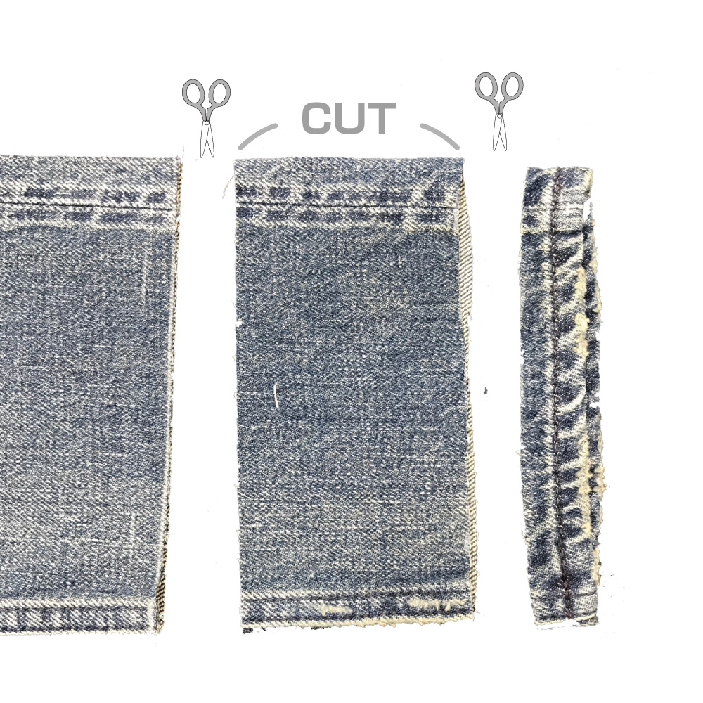 アタリ部分の寸法を計算してカットしたジーンズ本体と、